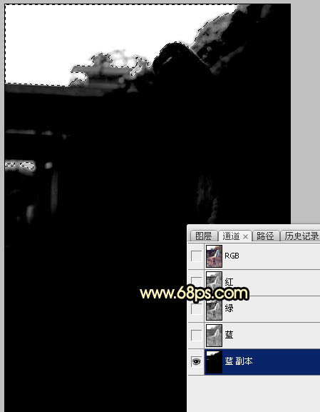 5、新建一个图层,按Ctrl + Alt + Shift + E 盖印图层。进入通道面板,把蓝色通道复制一份,得到蓝副本通道,对蓝副本通道进行处理。按Ctrl + M 调整曲线,增加明暗对比,然后把天空以外的部分涂黑。