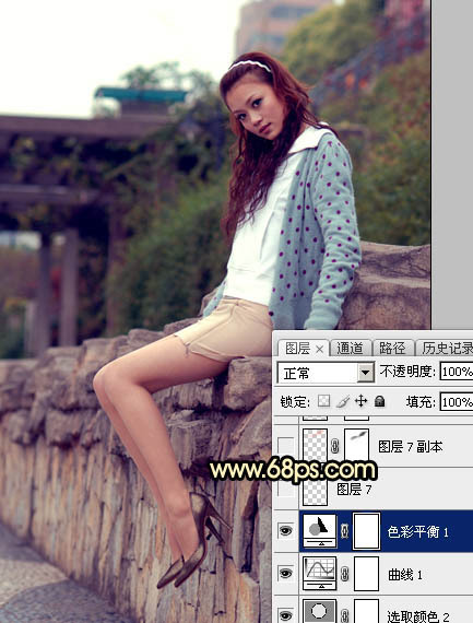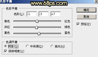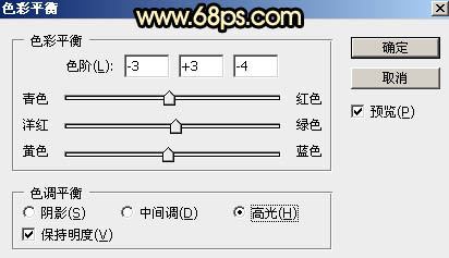 4、创建色彩平衡调整图层,对阴影,高光进行调整,参数及效果如下图。这一步主要给图片暗部增加蓝色。