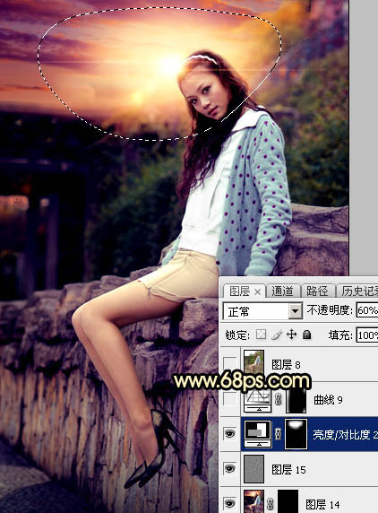 22、创建亮度/对比度调整图层,参数设置如图37,确定后把蒙版填充黑色,用白色画笔把高光区域擦出来,再适当降低图层不透明度,效果如图38。