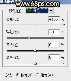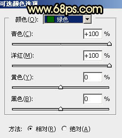 1、打开素材图片,创建可选颜色调整图层,对绿色进行调整,参数及效果如下图。这一步把图片中的绿色调暗一点。