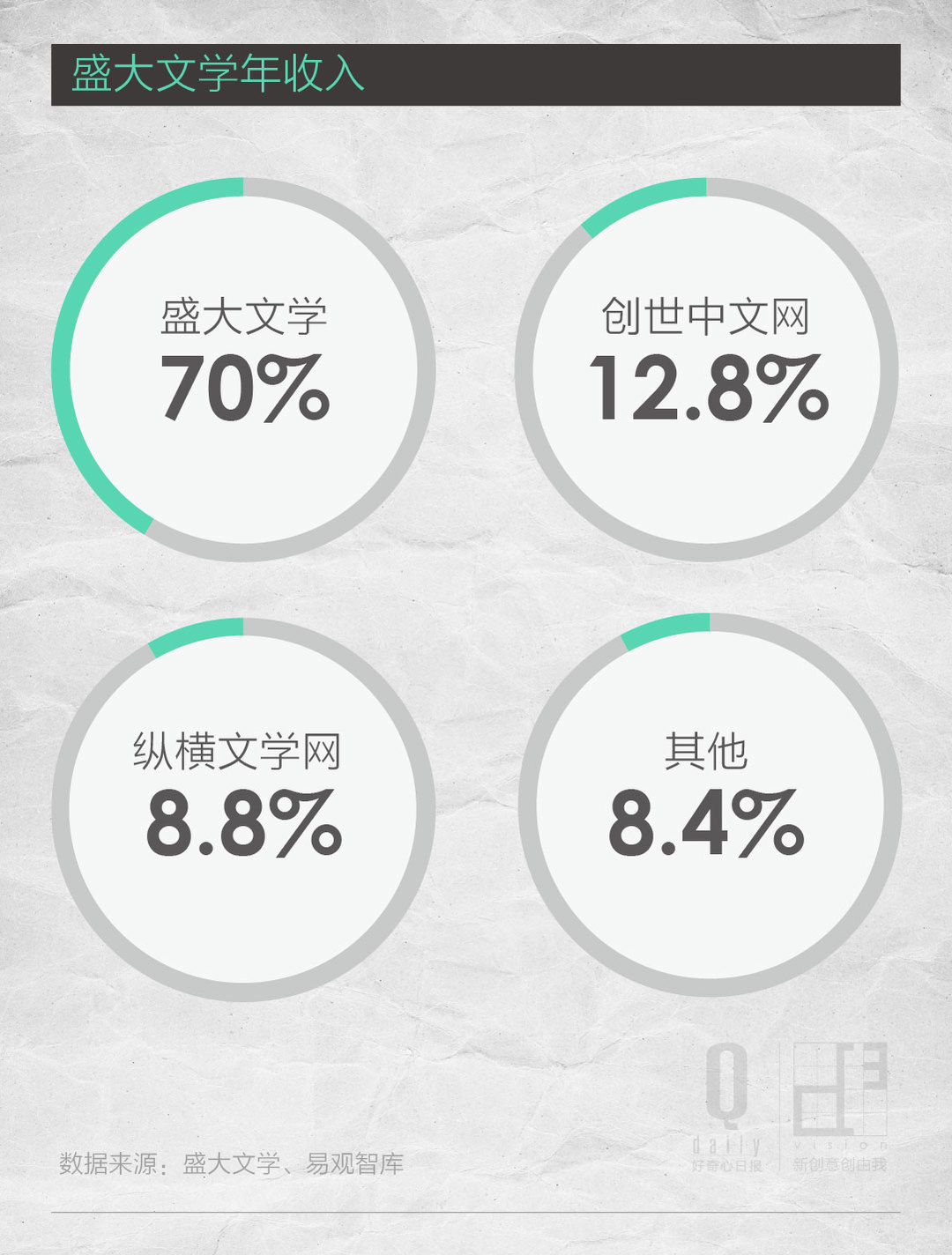 盛大文学旗下各网站总共占据网络文学市场超 70% 的份额,其中最早被收购回来的起点中文网独占 43%。