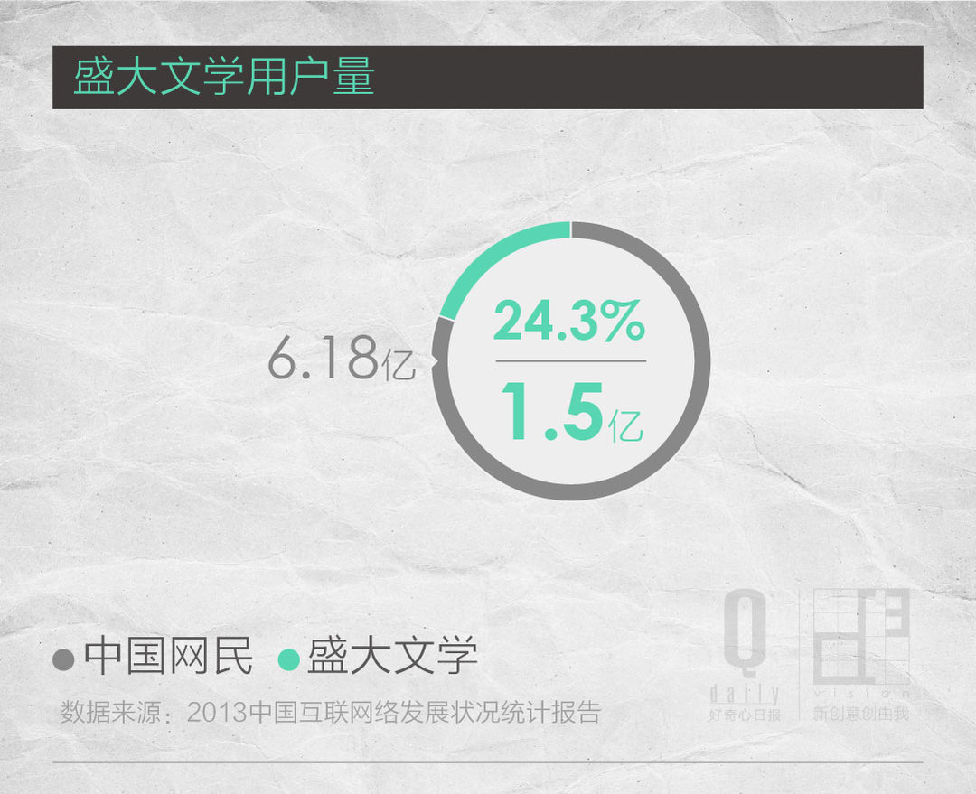 这些小说之所以能被选中改编成游戏或者电视剧,一个最重要的原因是在连载阶段它们已经积攒了足够高的人气。盛大文学的用户量约为 1.5 亿,占全国 6.18 亿网民的 24.3%。