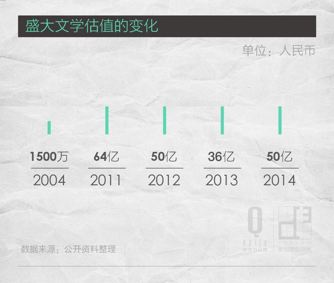 盛大文学的雏形,是从 2004 年盛大以 200 万美元(按当年汇率,约合 1500 万人民币)的价格买下“起点中文网”开始建立的。由于起点中文网是盛大当时唯一的网络文学资产,据此计算,2004 年时盛大文学的价值也只有 1500 万人民币。但在此后的10年里,网络文学市场日益壮大,上下游产业链也逐步完善,盛大文学的估值也水涨船高。2011 年和 2012 年,盛大文学曾两次启动赴美 IPO ,第二次启动时盛大文学的估值已经达到 50 亿人民币了。