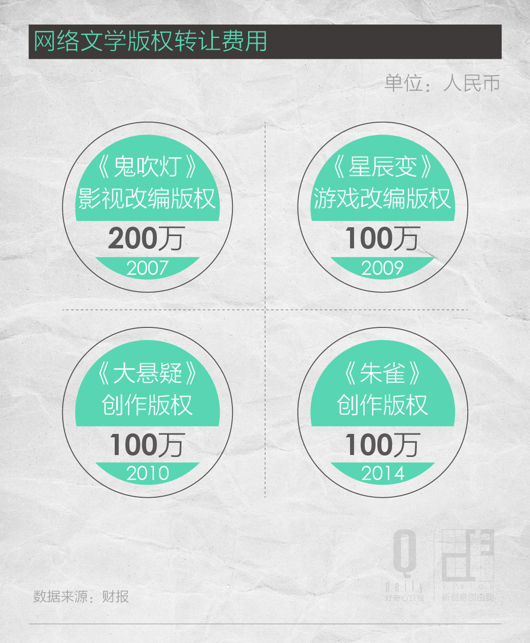 2006年在起点中文网开始发表的盗墓小说《鬼吹灯》,通过版权出让已经有了漫画版、网络游戏版、影视版、话剧等衍生内容。这部小说在起点中文网上的阅读量就近 2000 万。同名印刷版小说出版后的几个月里,4 次加印,总销量超过 1000 万册。2014 年 ,在网络文学版权费用总体升高的环境下,《鬼吹灯》影视版权以 200 万元的价格卖出。