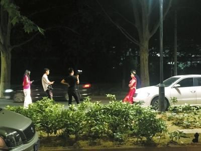 5月19日晚,记者来到迎宾路西段,只见在北半幅的快车道上,一辆车头朝东,另一辆车对着前辆车,还有人打应急灯,有摄影师及服务人员,他们正在为一对新人拍婚纱照(如图)。