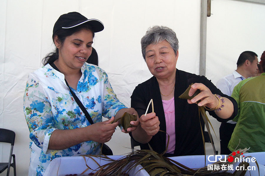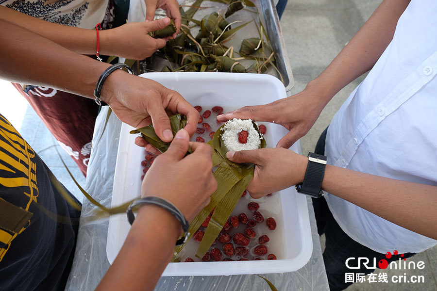 外国友人体验亲手包粽子。(摄影 王巍)