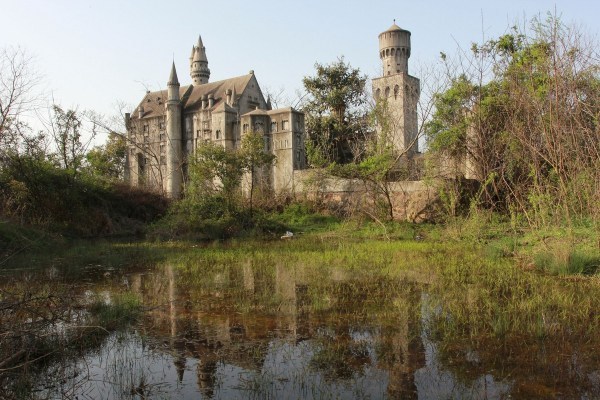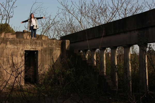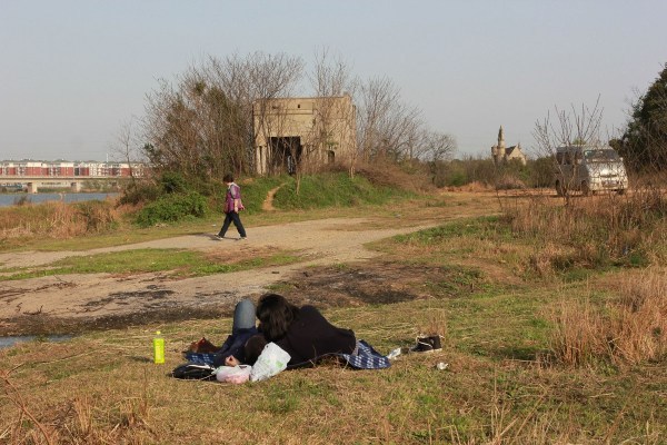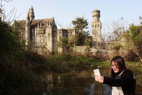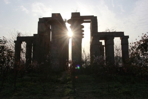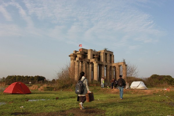 2015年3月22日,湖北武汉,市民在烂尾16年的万国公园里踏青、拍照;在金字塔、神庙建筑等废弃景点前支起帐篷、炊具,进行野餐 烧烤、宿营。不少人市民开着私家车来的,有人还带来了沙滩车。万国公园里,3座微缩版不过数米高的金字塔,大小相邻排列,经过10多年的风吹日晒,依稀能见当年的底色。20来根高大的圆柱形立柱,撑起一座巨大的神殿,石柱上的各种符号,代表不同的图腾。穿过一片农田,位置更高的地方,又是一片具有异国风情的建筑。