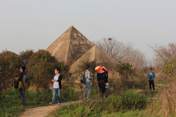 2015年3月22日,湖北武汉,市民在烂尾16年的万国公园里踏青、拍照,在金字塔、神庙建筑等废弃景点前支起帐篷、炊具,进行野餐烧烤、宿营。据了解,湖北武汉“万国公园”于1996年开工,1999年因资金不足、交通等问题,万国公园停工。2013年开始,烂尾多年的万国公园在网络上越来越红,网上甚至有详细的武汉万国公园攻略,万国公园里游客逐渐多了起来,还有不少年轻人前来拍摄婚纱照片。图为在“金字塔”前游览的市民。