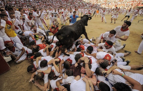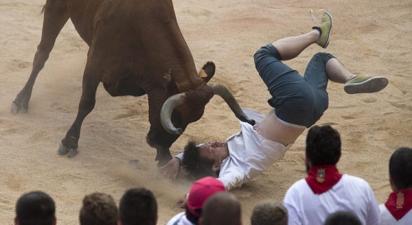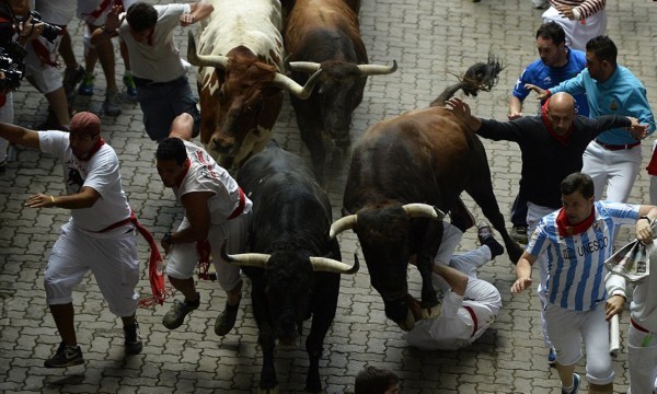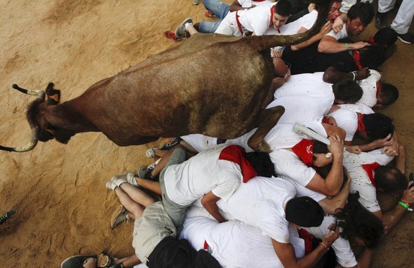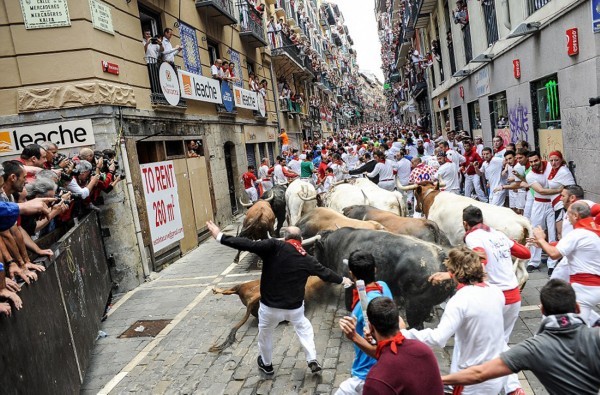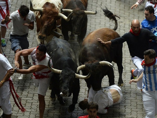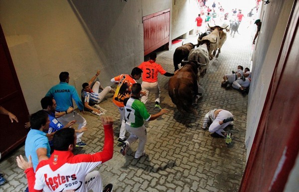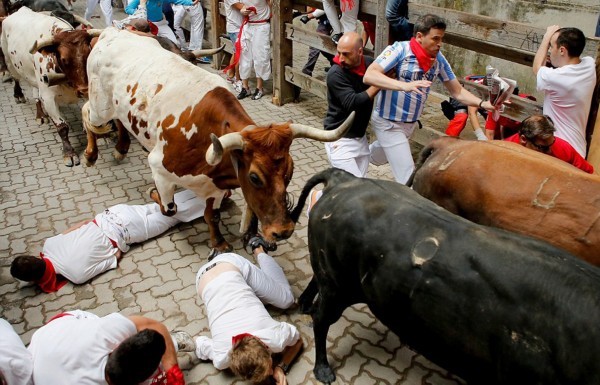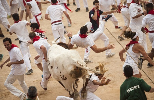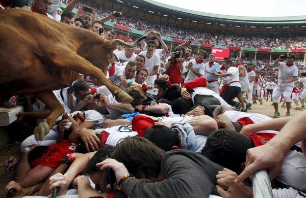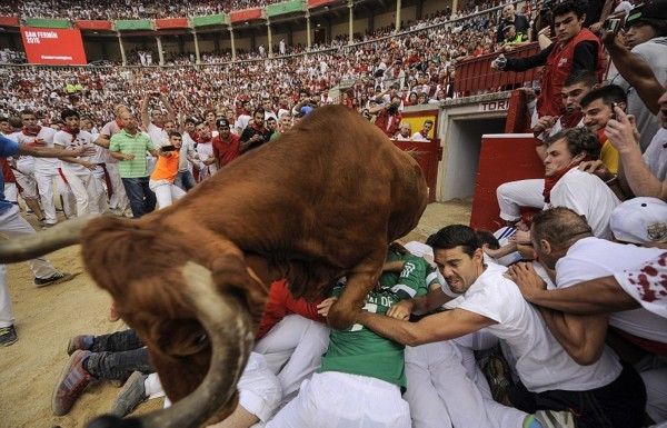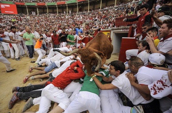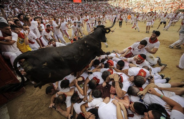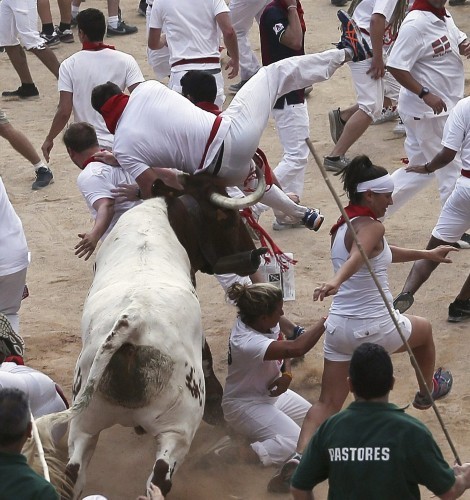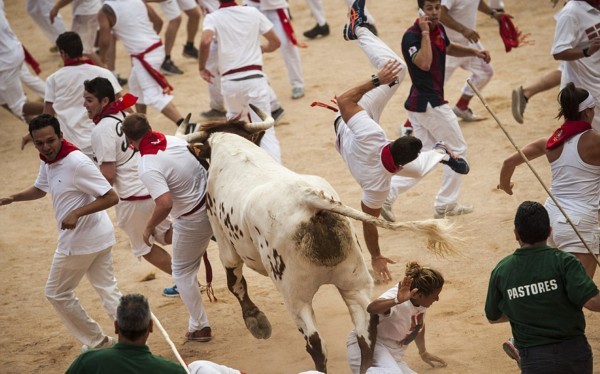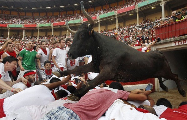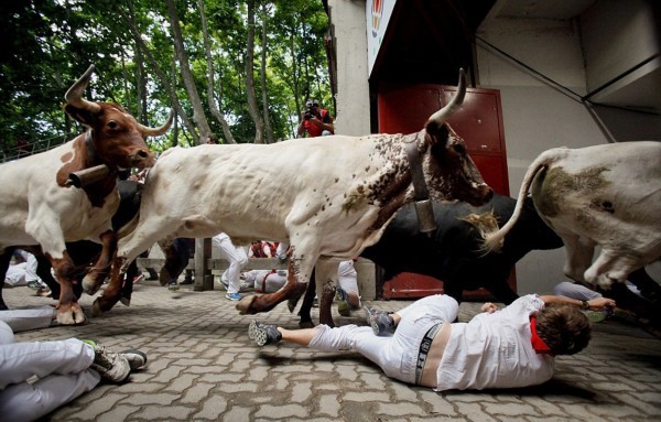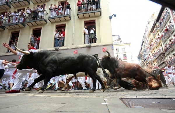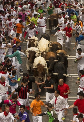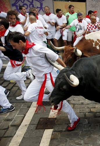 这些照片显示,在第二轮奔牛活动中,数以千计寻求刺激的人伴随着公牛狂奔,1名澳大利亚人被公牛角撞伤2次,另有2人受了轻伤。西班牙电视台上午8点播放的节目,可以看到人们与6头公牛在通往该市斗牛场的狭窄通道上奔跑。每天下午,这些公牛将被专业斗牛士在斗牛场上刺死。