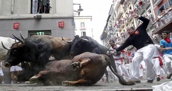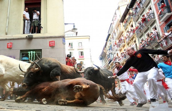 在通过潘普洛纳街头时,多头公牛相撞倒地。(网页截图)