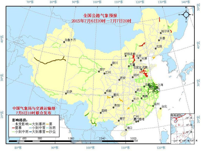 6日20时至7日20时,甘肃中北部、青藏高原大部、内蒙古西部和东南部、黑龙江北部、黄淮中东部、江淮中东部、江南中东部、台湾等地有小到中雨,其中,江南东北部、台湾南部等地部分地区有大到暴雨,局地大暴雨;上述局部地区还将伴有短时强降水、雷暴大风等强对流天气;另外,在新疆南部部分地区有沙尘天气;在辽宁南部、湖南西部、贵州南部等地局地有雾。