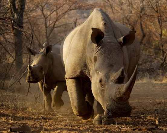 也许是老天奖励我们准时,进入公园没多久,就听向导低声说:"那边,看,犀牛!"望过去,一头成年黑犀牛带着一头小犀牛在不远处默默地吃草。犀牛的嗅觉非常灵敏,但视力不是很好,且脾性非常难捉摸,为了不惊扰它们也为了车队安全,向导把车熄了火,停在了行车道旁。而我们则打开车顶,探出身子用相机进行拍摄。拍摄这种大群的犀牛场面时,牛群在缓慢的移动,而我在优先确定好构图的情况下,也能在所需的位置直接对焦;7D2的对焦点高密度地覆盖摄取画面的大部分空间,就算拍摄画面内突然出现一只激烈运动的狂躁公牛,相机也可以针对它的位置迅速对焦。就这样,我们一路用镜头轻松地追踪着犀牛们,一边吃一边在面前缓慢移动,渐渐向远方走去。