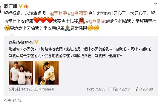 5日,贾静雯在微博报喜,表示自己与相差9岁的小男友修杰楷有了孩子,这也是她的第二个孩子。修杰楷在微博晒出贾静雯怀孕照片,小腹微隆,十分甜蜜,并还深情发文称,谢谢你,小天使,一路陪伴着我们一起迎接另一个小小天使的到来~谢谢你,妈咪,谢谢你让我成为最幸运的人~我会用我的幸运,转换成幸福,让我们一起拥有!
