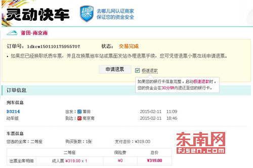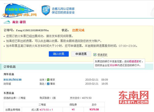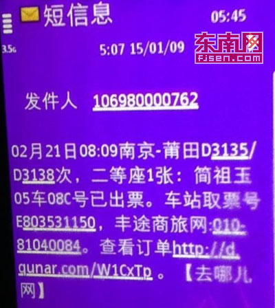 1月10日,她上“去哪儿网”预定了两张从莆田到南京往返的动车票,“这是我第一次上网买动车票,所以不知道要上‘12306铁道部火车票网上订票唯一官网’购票更安全。”陈小姐于是网上直接输入关键字。