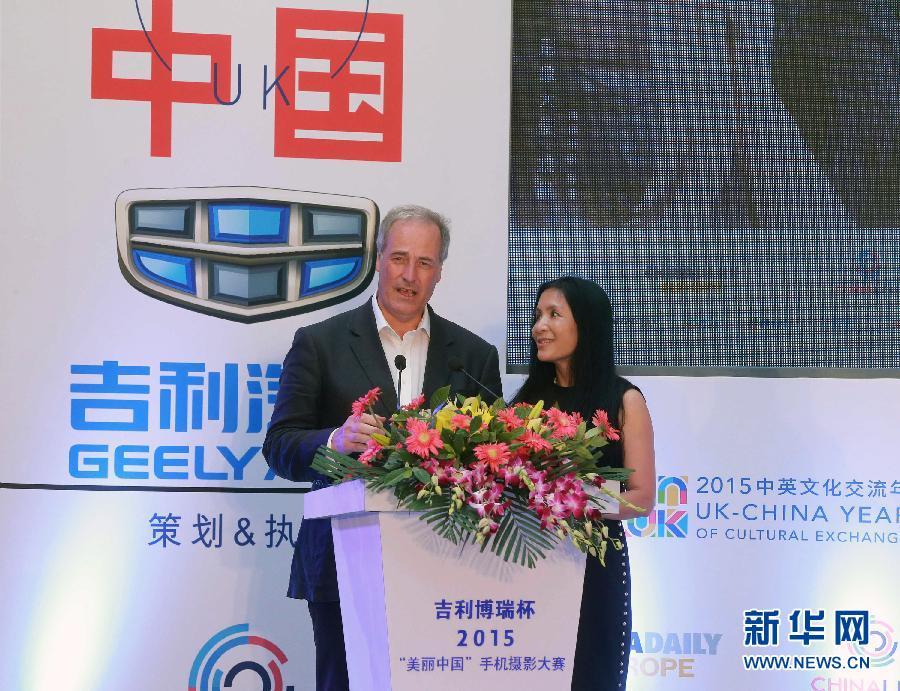 8月10日,大赛国际荣誉摄影师麦克·贝茨(左)现场致辞。当日,2015“美丽中国”手机摄影大赛启动仪式在北京举行。大赛设风景、建筑、人文、美食、家庭、在路上等6个竞赛单元,特邀各界近30位知名人士作为特邀荣誉摄影师进行拍摄,并在淘宝拍卖会上进行义拍,所得善款将全部捐赠给公益慈善组织。新华社发(陈健男 摄)