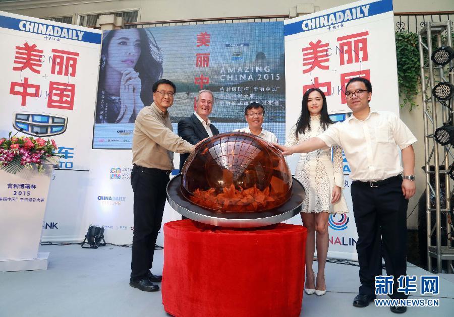 8月10日,嘉宾在启动仪式上共同按下“美丽中国”手机摄影大赛启动球。当日,2015“美丽中国”手机摄影大赛启动仪式在北京举行。大赛设风景、建筑、人文、美食、家庭、在路上等6个竞赛单元,特邀各界近30位知名人士作为特邀荣誉摄影师进行拍摄,并在淘宝拍卖会上进行义拍,所得善款将全部捐赠给公益慈善组织。新华社发(陈健男 摄)