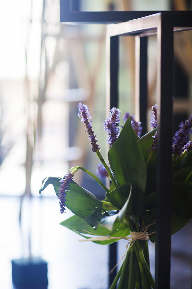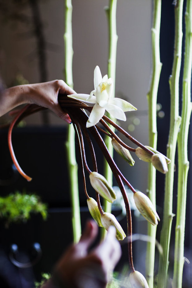 相对普通的花瓶,我们找了一些尽量高个子的道具来填充房间的宽敞空间。把拍摄主阵地选择在靠近窗户的地方,同时用尽量多的花材去遮挡光线强烈的落地窗,使光比更趋于柔和。
