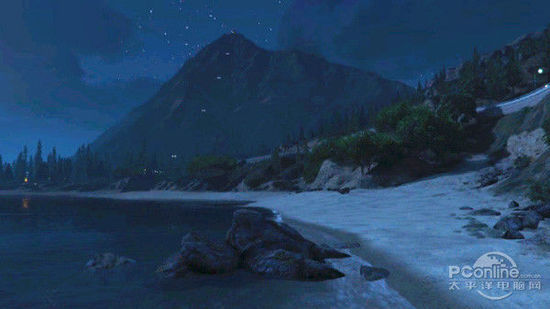洛圣都的夜色之美极为醉人,在郊外山区地方,漫天繁星点点,沙滩上的海浪阵阵袭来,游戏特效堪称一绝。在这里,你可以找到非常好的位置做取景。像下图有引导观者作用的,称为引导性构图,是利用画面中的线条(不一定是线条,有方向性的事物即可)把观者的目光延伸去远方,来感受一张摄影作品的层次感。