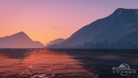 其实游戏世界里的拍照跟现实生活中的拍照没有很大区别。同样可以变焦,同样可以制造景深,只是不可控制曝光还有不可控制对焦点。但从摄影构图上来讲,两者可以说是一致的。GTA V里的相机还加入了滤镜与相框功能,相当前卫。下图是在游戏时间的黄昏时分,海面与远处大山成为了画面主要景物,三分一构图法则令观者无论看山还是看水都能有非常舒服的视觉感受。